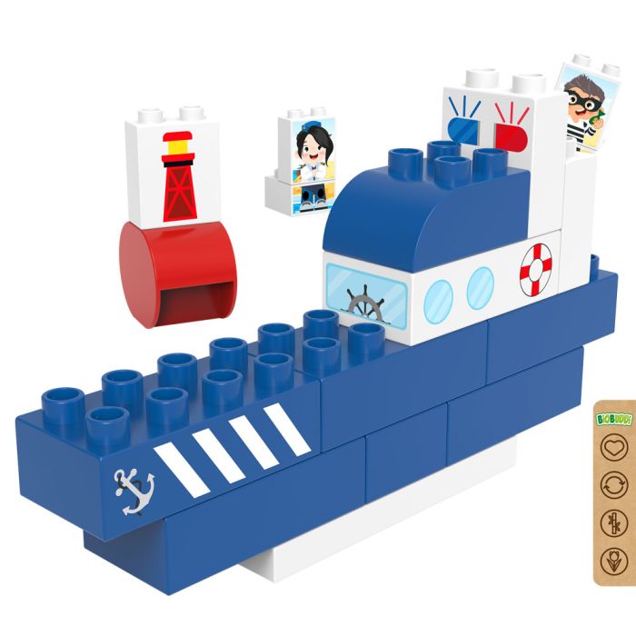 Das Polizeiboot-Spielset besteht aus 28 verschiedenen Teilen, die aus Resten der Zuckerrohrpflanze hergestellt werden. Die Blöcke sind umweltfreundlich, recycelbar, nachhaltig und auch mit anderen Marken austauschbar. Die Verpackung ist so gestaltet, dass sie ein Teil des Produkts ist. Sie besteht aus FSC-Karton und mit einem einfachen "Push" lassen sich verschiedene Karten leicht herausnehmen und in die beiliegenden Kartenhalter für noch mehr Spielspaß einsetzen.