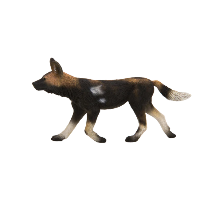 Dies ist eine handbemalte Spielzeugfigur, die den afrikanischen Wildhund lebensecht darstellt. Diese Figur stellt den afrikanischen Wildhund detailgetreu dar, einschließlich seines charakteristischen mehrfarbigen Fells mit einzigartigen Mustern in Schwarz, Gelb, Weiß und Braun.