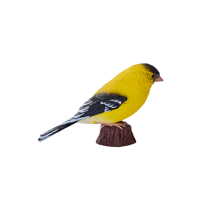 Dies ist eine sorgfältig gefertigte Figur, die die markanten Merkmale dieses kleinen, farbenfrohen Singvogels realistisch einfängt. Der Distelfink (Spinus tristis) ist im Sommer für sein leuchtend gelbes Gefieder bei den Männchen mit kontrastierenden schwarzen Flügeln und Kappe bekannt.