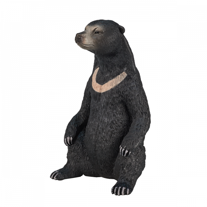 Dies ist eine detailreiche, handbemalte Spielzeugfigur, die diese kleine, aber starke Bärenart realistisch darstellt. Der Malaienbär wird mit seinem kurzen, glänzenden schwarzen Fell und dem charakteristischen halbmondförmigen gelben Fleck auf der Brust dargestellt.