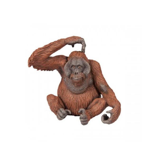 Dies ist eine detaillierte und realistische Spielzeugfigur, die einen Orang-Utan darstellt. Die Figur stellt einen Orang-Utan mit präzisen Details dar, darunter rotbraunes Fell und ein ausdrucksstarkes Gesicht.