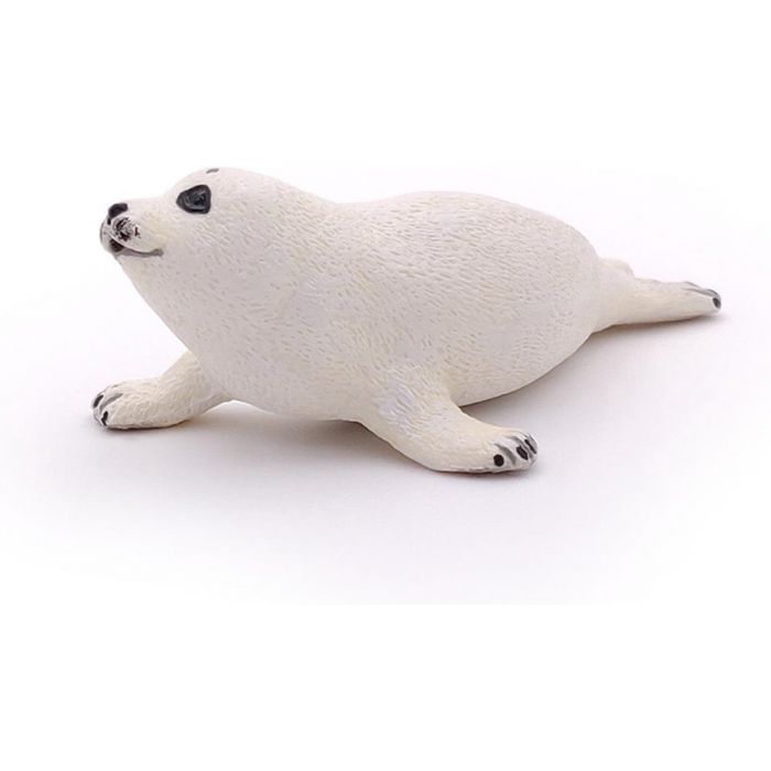 Dies ist eine detaillierte und handbemalte Robbenfigur. Das weiche, weiße Fell ist sorgfältig geformt, um das flauschige Aussehen einer jungen Robbe widerzuspiegeln. Die großen, ausdrucksstarken Augen tragen zum niedlichen Aussehen bei.