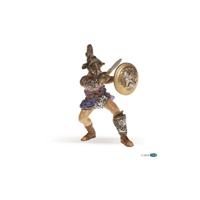 Der Gladiator steht in einer dynamischen Pose, bereit zum Kampf, mit einem Schwert in der einen und einem Schild in der anderen Hand. Seine Ausrüstung, einschließlich Helm mit Gesichtsschutz, Rüstung und Sandalen, ist detailgetreu dargestellt.