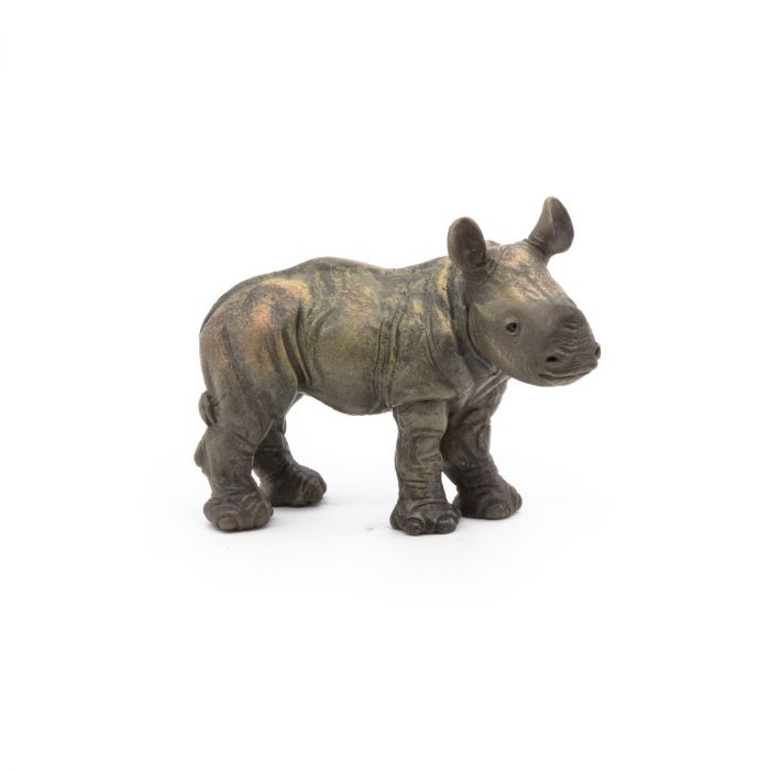 Dies ist eine handgemalte Figur, die ein junges Nashorn darstellt. Das Nashornbaby wird mit detaillierter Hautstruktur und ausdrucksstarken Gesichtszügen dargestellt, was zu einem realistischen Aussehen beiträgt.