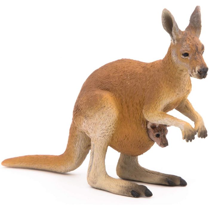 Dies ist eine detaillierte und lebensechte Spielzeugfigur, die ein Känguru mit seinem Jungen im Beutel darstellt. Die Figur zeigt ein Känguru mit rotbraunem Fell und einem aus dem Beutel schauenden Jungtier, was für eine naturgetreue Darstellung sorgt.