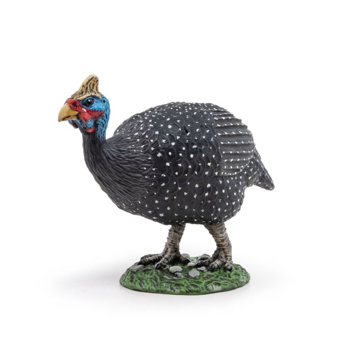 Dies ist eine detaillierte und handbemalte Figur eines Perlhuhns. Das Perlhuhn ist sorgfältig mit lebensechten Details wie geflecktem Gefieder, einem kleinen Kopf mit charakteristischem Kamm und einer natürlichen Haltung gefertigt.