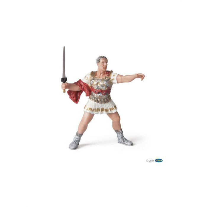 Julius Cäsar wird in einer dynamischen Pose dargestellt: In einer Hand hält er ein Schwert, mit der ausgestreckten Hand befehligt er seine Armee. Er trägt eine Tunika mit gefaltetem Umhang, was zum realistischen Aussehen beiträgt.