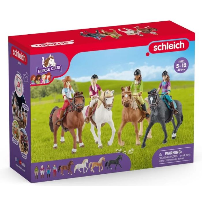Das Set enthält acht sorgfältig gestaltete Figuren. Dazu gehören die vier Horse Club-Mädchen Hannah, Lisa, Sofia und Sarah, jede mit ihrem eigenen einzigartigen Stil und ihrer eigenen Persönlichkeit, sowie ihre vier Pferde: Cayenne, Storm, Mystery und Blossom. Die Figuren und Pferde sind detailliert und handbemalt, wodurch sie lebensecht und für kleine Kinder ansprechend sind.