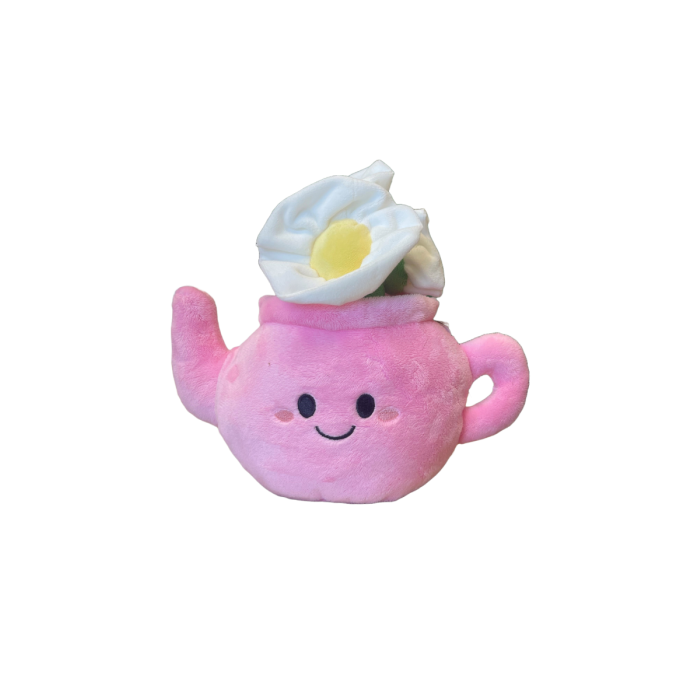 Die Take Me Home Plant Plüsch-Teekanne. Eine niedliche und weiche rosa Plüsch-Teekanne mit einer blühenden Blume. Perfekt als Dekoration, kuscheliger Freund oder einzigartiges Geschenk!